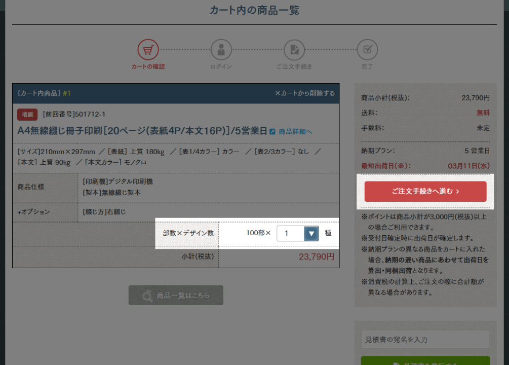 カート確認画面でデザイン数を指定し、内容に問題がなければご注文手続きへ進み、注文を完了してください。