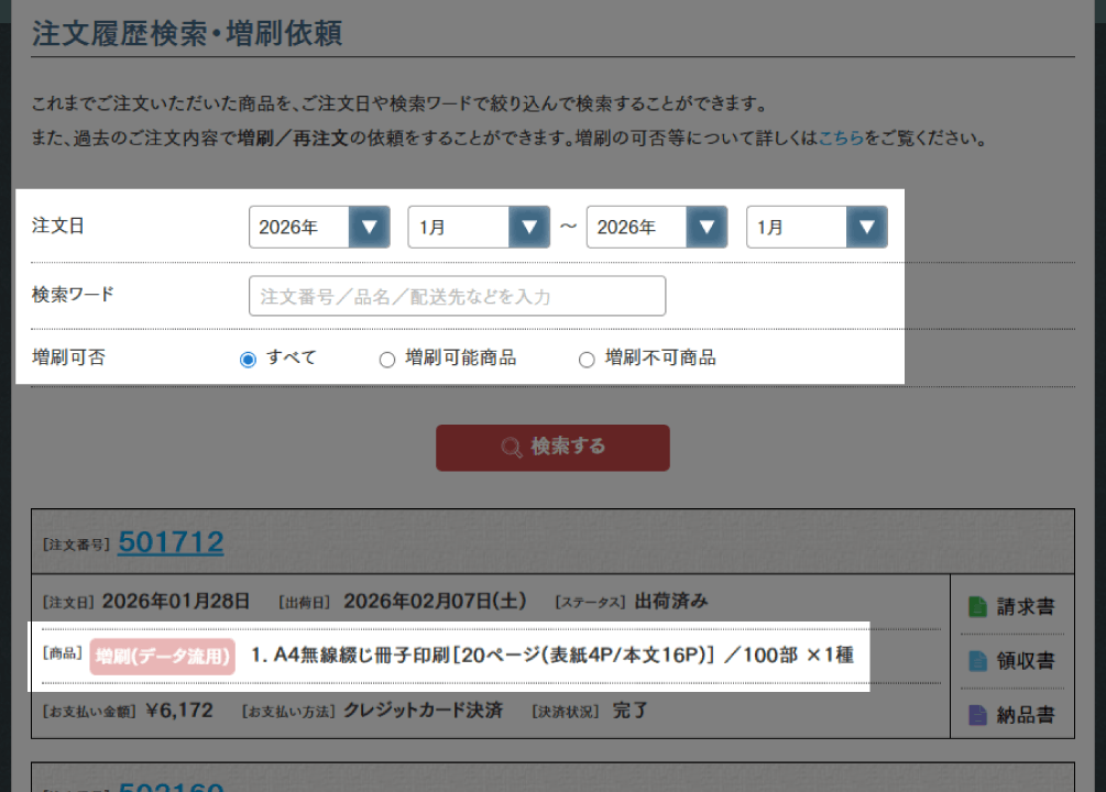 注文履歴・増刷ページで、注文日・検索ワード・増刷可否を指定して対象商品を検索します