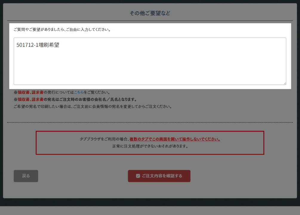 その際に、ご注文時のメッセージ欄に「増刷元の注文番号 増刷希望」と記載し、注文を完了してください。弊社にてご注文を確認後、出荷日などをご連絡します。
