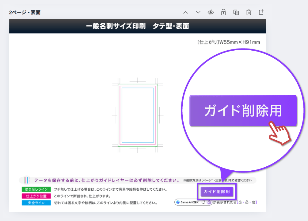 テンプレ-トの仕様上、Canvaデータ作成ガイドの内容と一部異なる点があります。テンプレ-ト内の注意事項をご確認のうえ、データを作成ください。