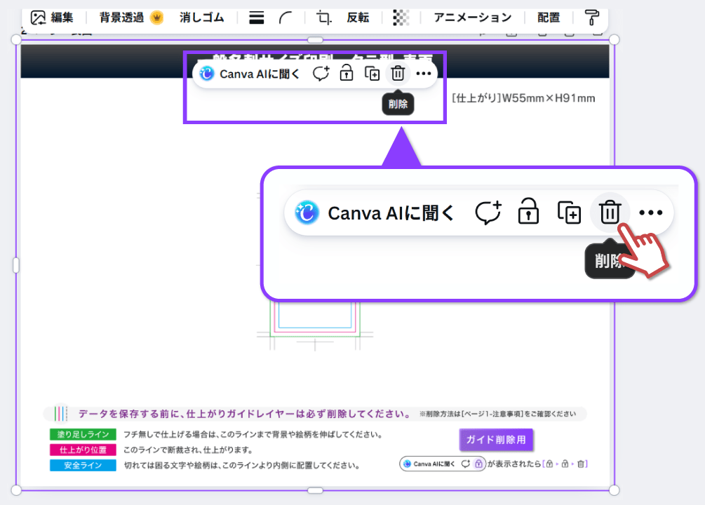 また、データを保存する前に、仕上がりガイドレイヤーの削除が必要となります。削除方法については、以下の手順をご確認ください。