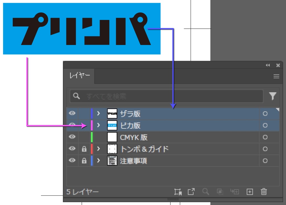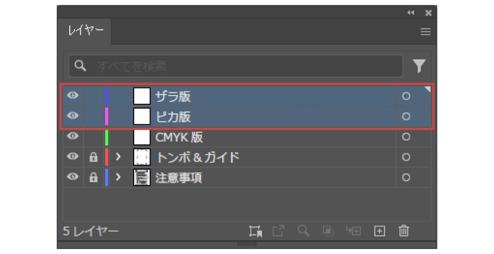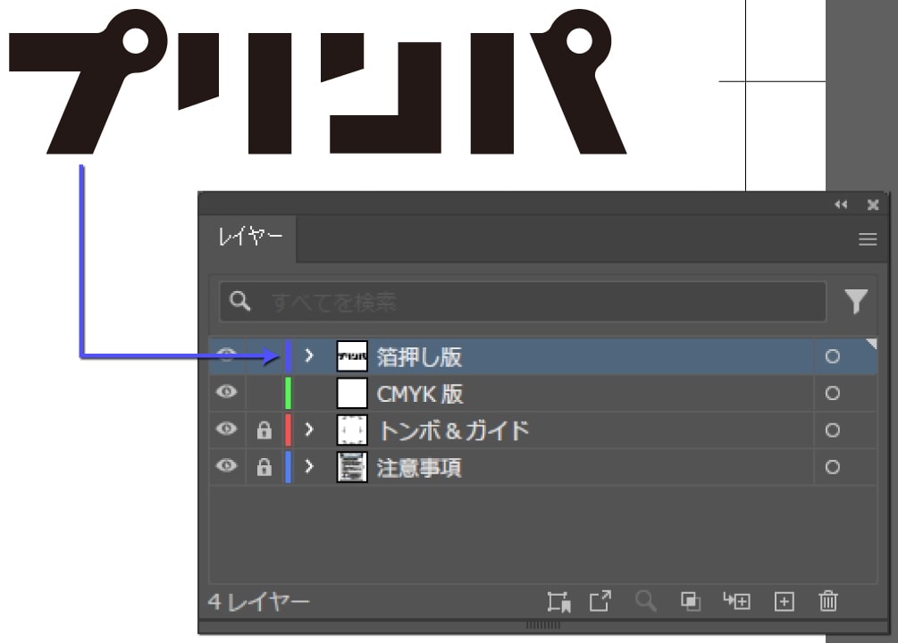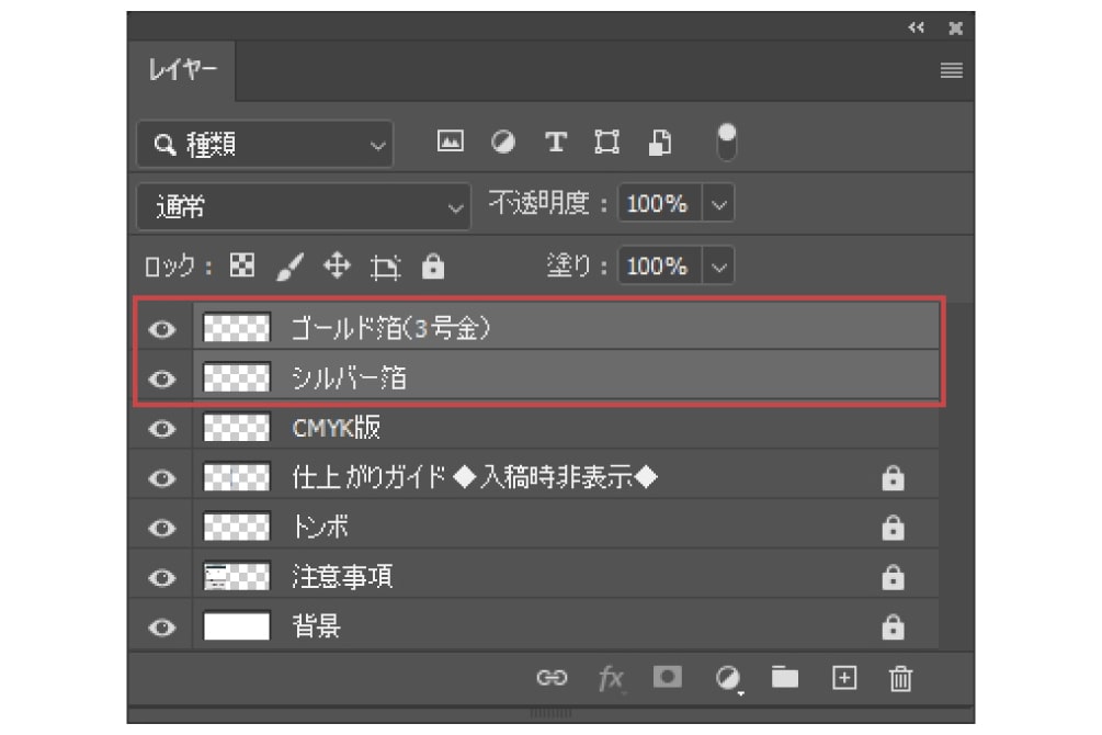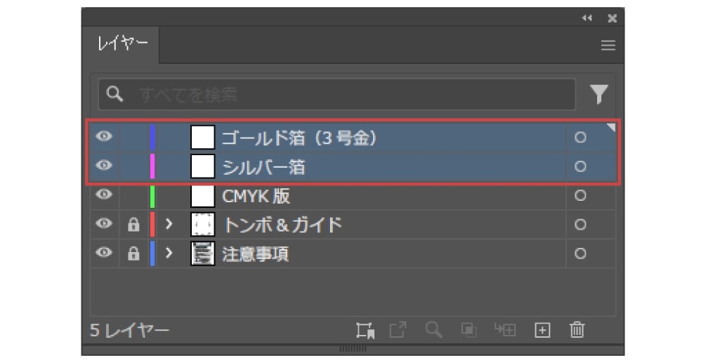多少ズレても白がでないように、箔押し加工部分の下にも絵柄を印刷用レイヤーに配置してください。